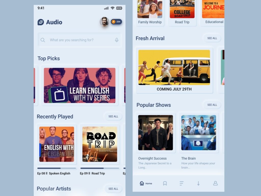 Your product must allow users to browse and search audio with the advance search feature enabled in your app. This feature should be helping user to search category, tracks, music, podcasts, artists so that they can easily find what they are looking for.